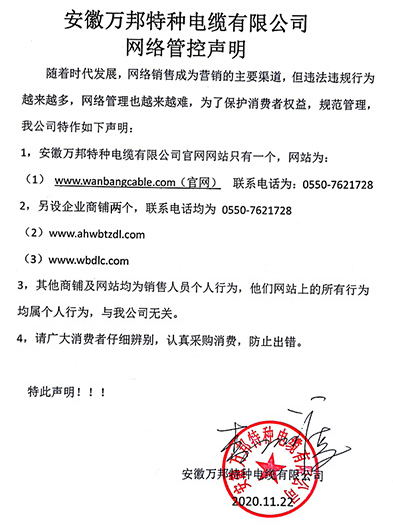 鄭重聲明:安徽萬邦特種電纜有限公司官方網站為:www_wanbangcable_com.bingocasting.com,除此之外無任何子網站或合作網站,其余均為假冒偽劣。電話:0550-7621728 13485756353 地 址:安徽省天長市滁州高新技術產業開發區經四路29號